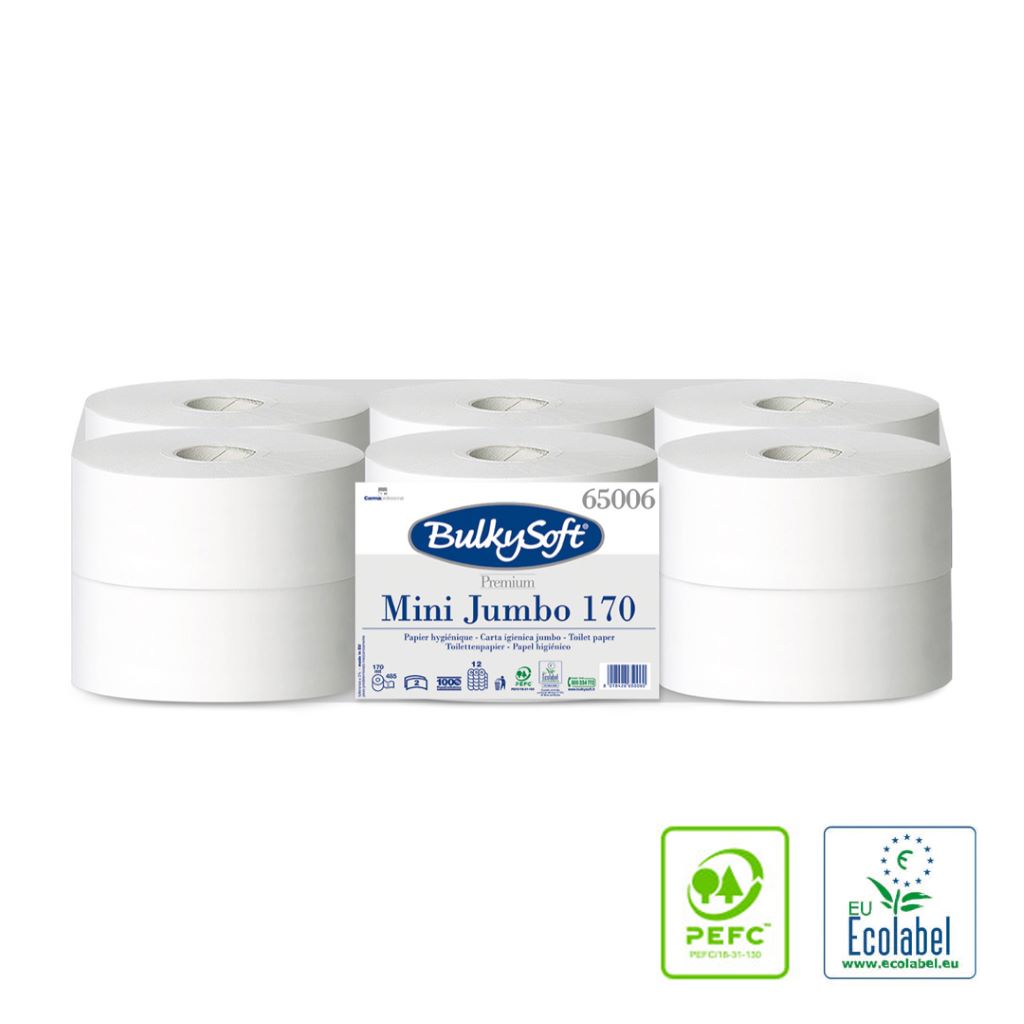 Paper higiènic de qualitat superior de 2 capes llis, 170 mt i mandril de 60 cm de diàmetre. Cada paquet conté 12 rotllos. Fabricat mitjançant cel·lulosa provinent de boscos sostenibles. Amb certificació Ecolabel.